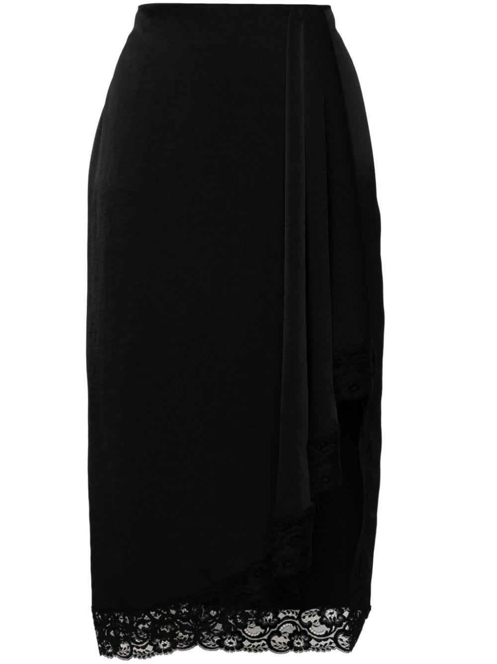 asymmetric lace-detail skirt Highlights - Black - Cotton blend - Satin finish - Elasticated waistband - Pleat detailing - Draped detailing - Lace trim - Asymmetric hem - Side zip fastening Made in Italy Composition Polyester 100%, Cotton 80%, Polyamide 20% SIZE & FIT Model measurements Height 5 ft 10 in(1.77 m) Bust/Chest 32.28 in(82 cm) Hips 35.03 in(89 cm) Waist 25.19 in(64 cm) FittingInformation Designed with an asymmetric hem, this skirt is intended to be worn just below the waist Made from a lightweight non-stretch fabric, this piece offers minimal elasticity when worn This piece fits true to size – take your usual size