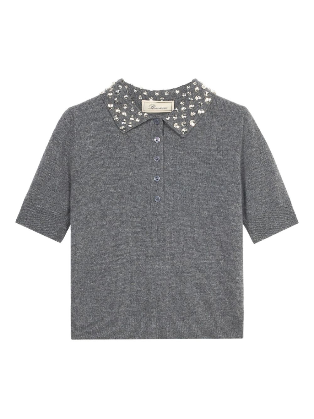 beaded-collar polo top Highlights - Grey - Beaded embellishment - Button placket - Ribbed cuffs - Short sleeves Imported Composition Wool 100%, glass 100% Washing instructions Read Manufacturer Guidelines