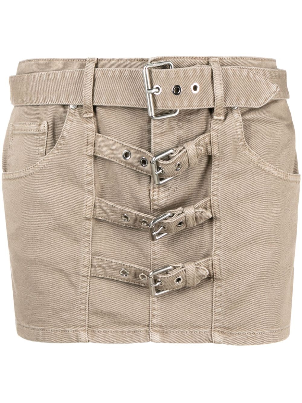 buckle-embellished denim miniskirt Highlights - Taupe brown - Stretch-cotton - Silver-tone hardware - Belt loops - Decorative buckle detailing - Front buckle fastening - Classic five pockets - Straight hem - Thigh-length Imported Composition Cotton 98%, Elastane 2% SIZE & FIT Model measurements Height 5 ft 10 in(1.78 m) Bust/Chest 30.7 in(78 cm) Hips 36.22 in(92 cm) Waist 25.59 in(65 cm) Washing instructions Machine Wash