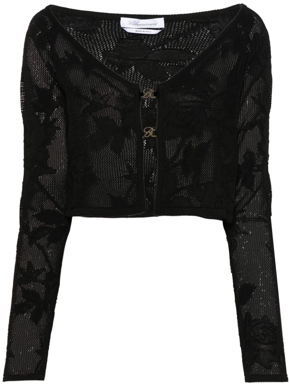 crochet-knit cardigan Highlights - Black - Crochet knit - Floral pattern - Openwork areas - Picot trim - Sweetheart neck - Long sleeves - Logo-buckle detail - Cropped - Unlined - Gold-tone hardware - Front buckle fastening Made in Italy Composition Viscose 70%, Polyamide 20%, Polyester 10% SIZE & FIT Model measurements Height 5 ft 9 in(1.76 m) Bust/Chest 31.88 in(81 cm) Hips 35.43 in(90 cm) Waist 24.8 in(63 cm) FittingInformation Designed for a close fit throughout Made with a midweight knit, this piece offers some stretch This piece fits true to size – take your usual size