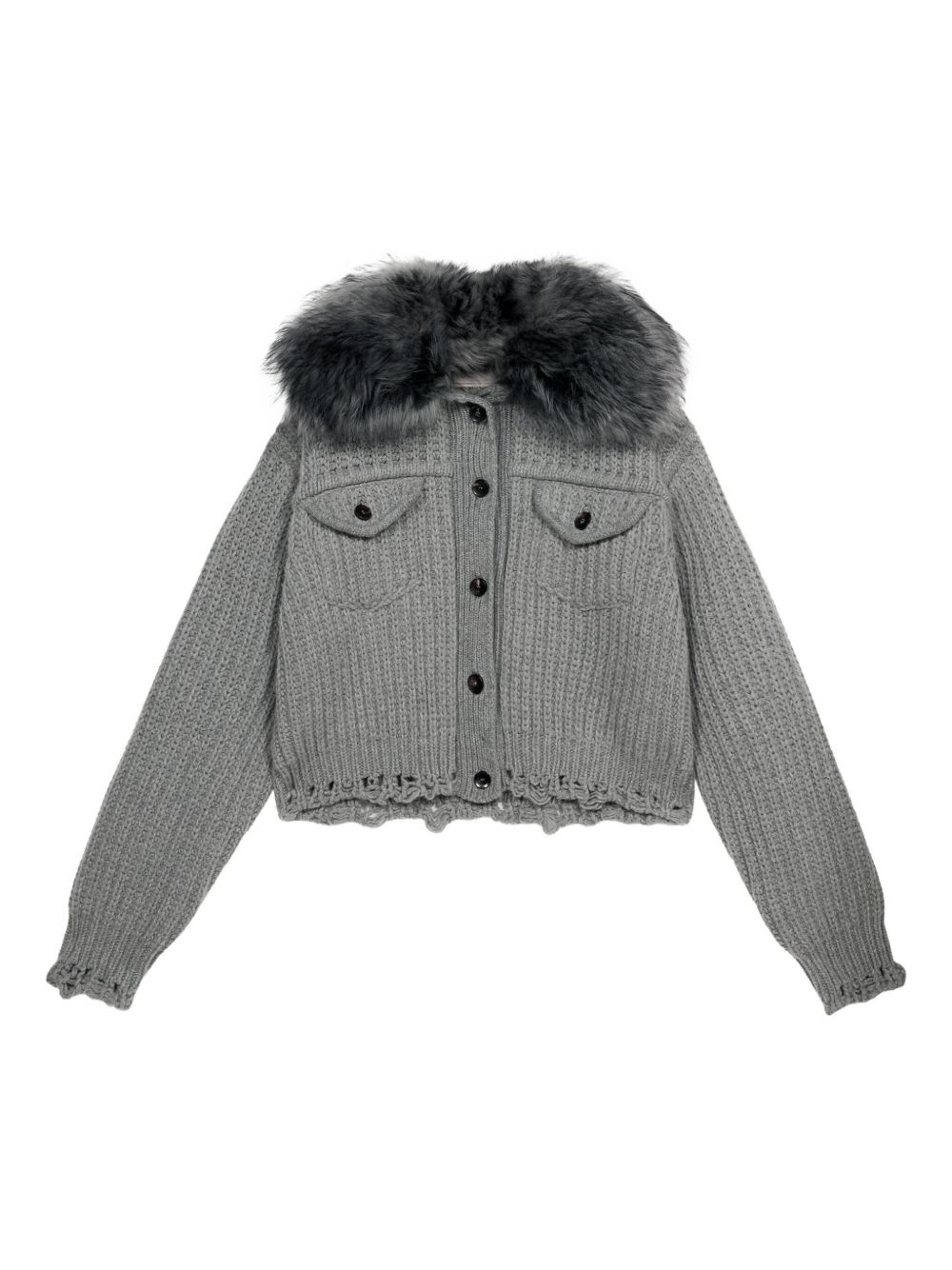 cropped ribbed cardigan Highlights - Grey - Button-front closure - Chest flap pockets - Oversized sleeves Imported Composition Goat Fur 100%, Cashmere 100%, Wool 90%, Virgin Wool 10% Washing instructions Read Manufacturer Guidelines