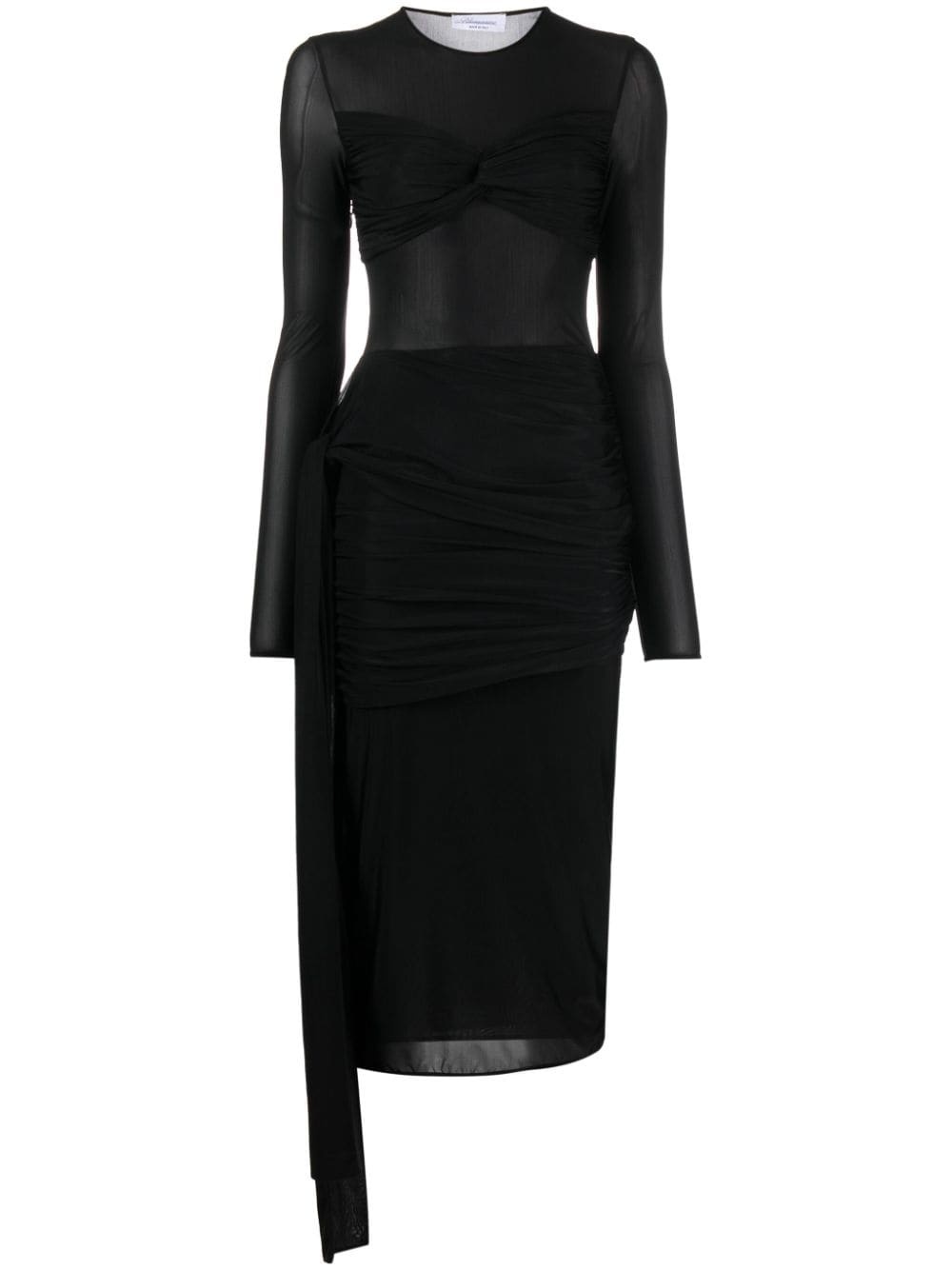 draped-detail midi dress Highlights - Black - Stretch-design - Semi-sheer construction - Draped detailing - Ruched detailing - Round neck - Concealed side zip fastening - Side tie fastening - Long sleeves - Straight hem - Mid-length - Lined skirt Made in Italy Composition Outer: Polyamide 77%, Spandex/Elastane 23% Lining: Polyamide 77%, Spandex/Elastane 23% SIZE & FIT Model measurements Height 5 ft 9 in(1.76 m) Bust/Chest 31.88 in(81 cm) Hips 35.43 in(90 cm) Waist 24.8 in(63 cm) FittingInformation Designed for a close fit throughout Made from a midweight stretch fabric, this piece offers elasticity and flexibility when worn This piece fits true to size – take your usual size Washing instructions Machine Wash