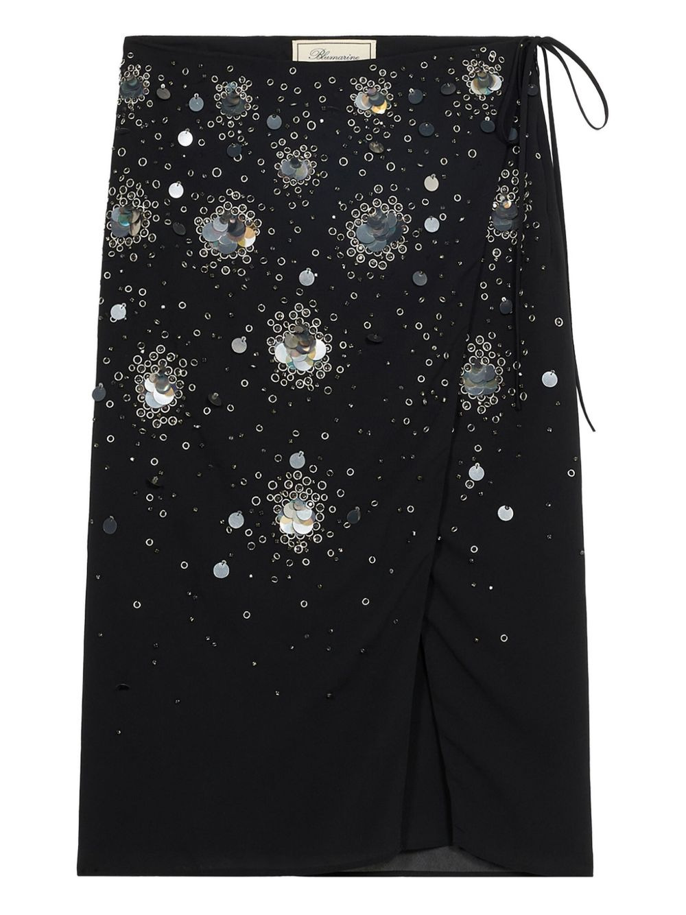 embroidered-sequins wrap mid skirt Highlights - Black - Embroidered mirrored sequins - Embroidered metal rings - Wrap design - Mid lenght Imported Composition Polyimide 100%