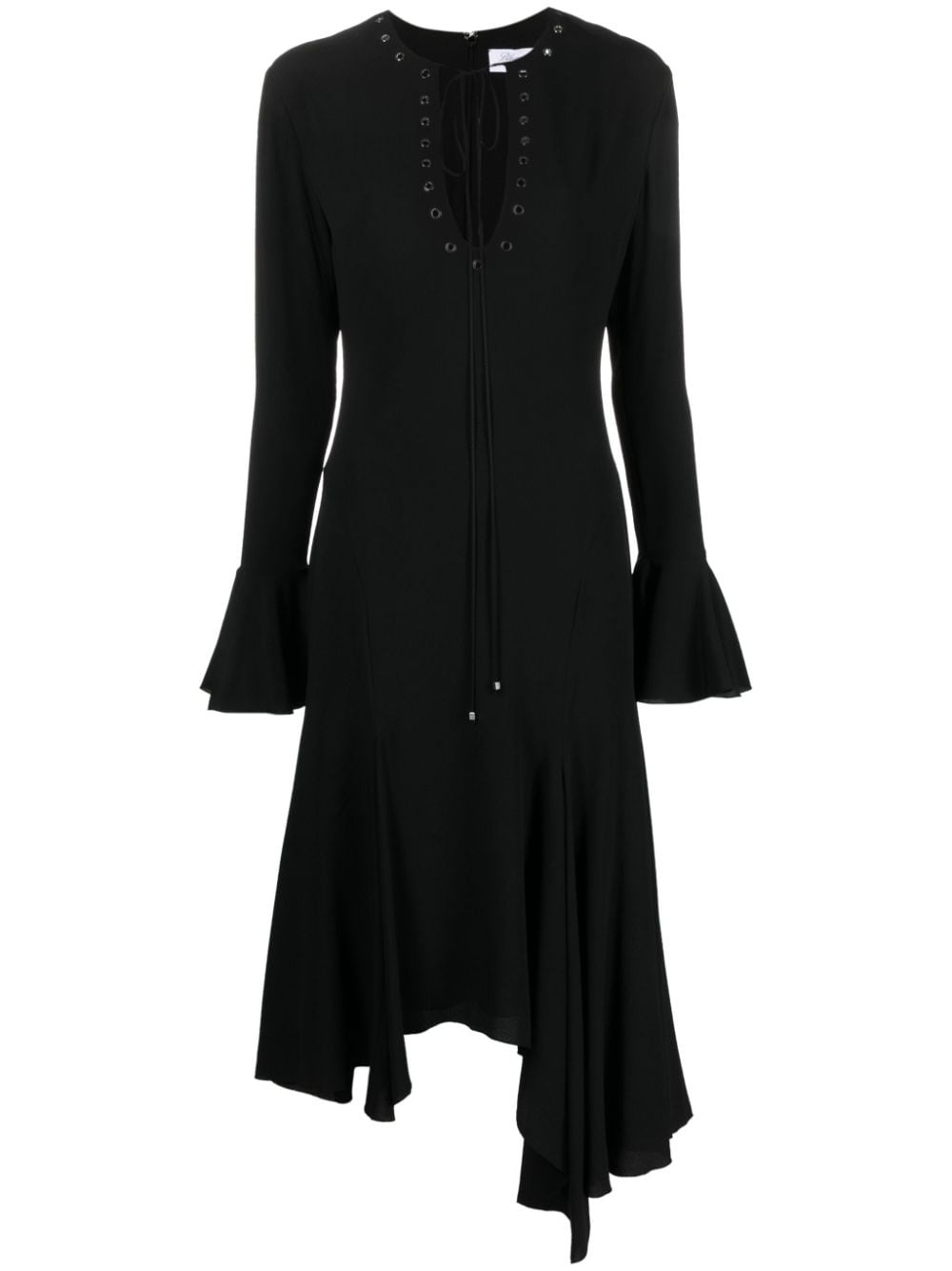 eyelet-detail asymmetric dress Highlights - Black - Silver-tone hardware - Metal eyelet detailing - Round neck - Front tie fastening - Concealed rear zip fastening - Long sleeves - Flared cuffs - Asymmetric hem - Mid-length Made in Italy Composition Outer: Acetate 55%, Silk 45% Lining: Polyester 100% SIZE & FIT Model measurements Height 5 ft 10 in(1.79 m) Bust/Chest 33.07 in(84 cm) Hips 35.82 in(91 cm) Waist 24.01 in(61 cm) FittingInformation Designed for a slim fit that sits just away from the body offering a close yet comfortable fit Made from a midweight non-stretch fabric This piece fits true to size – take your usual size