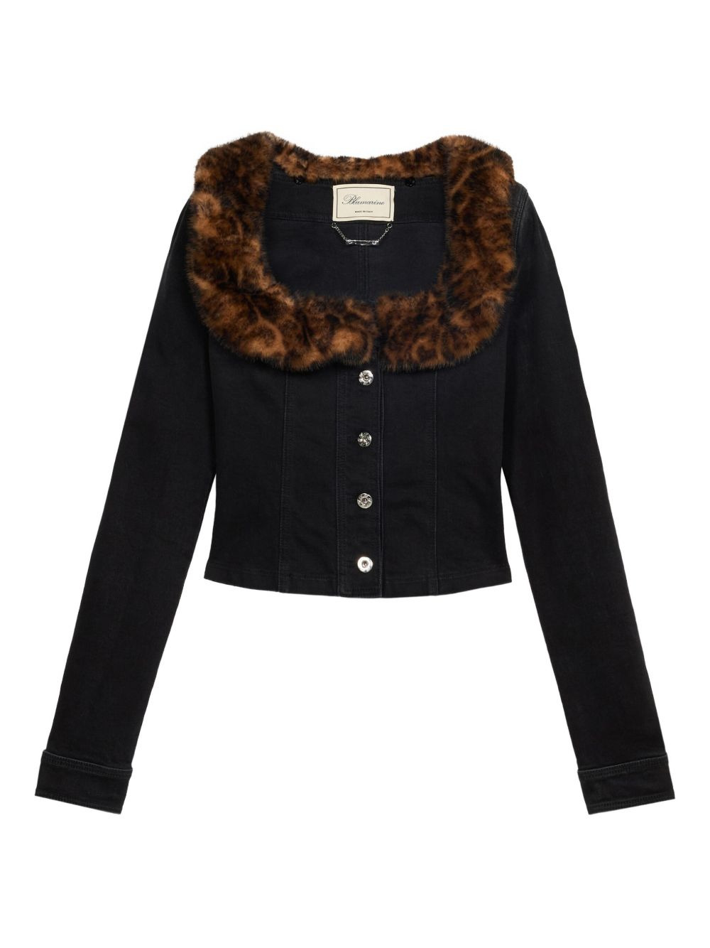 faux-fur collar denim jacket Highlights - Black - Faux-fur trim - Button fastening - Long sleeves - Cropped design Imported Composition Polyester 100%, Cotton 98%, Elastane 2% Washing instructions Read Manufacturer Guidelines