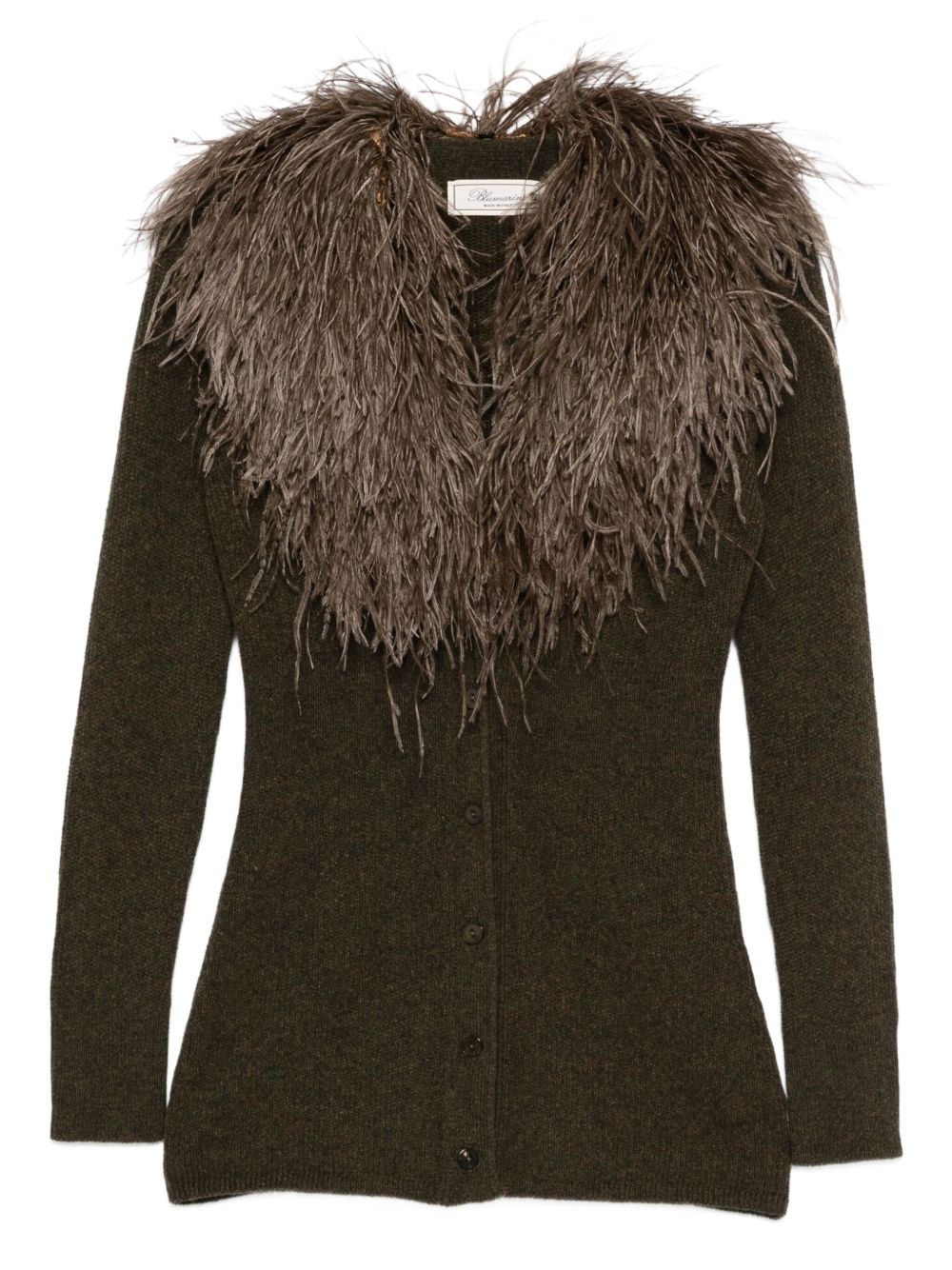feather-trimmed wool cardigan Highlights - Bark green - Feather trim - Button fastening - Long sleeves - Ribbed cuffs - Wool Made in Italy Composition Outer: Wool 100%, Ostrich Feather 100% Lining: Polyester 100% SIZE & FIT Model measurements Height 5 ft 10 in(1.78 m) Bust/Chest 33.85 in(86 cm) Hips 36.61 in(93 cm) Waist 26.77 in(68 cm) Washing instructions Dry Clean Only