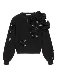 flower-embellished ribbed sweater Highlights - Black - Ribbed knit - Flower embellishments - Rhinestone details - Puff sleeves - Crew neck Imported Composition Fabric 100% Washing instructions Read Manufacturer Guidelines