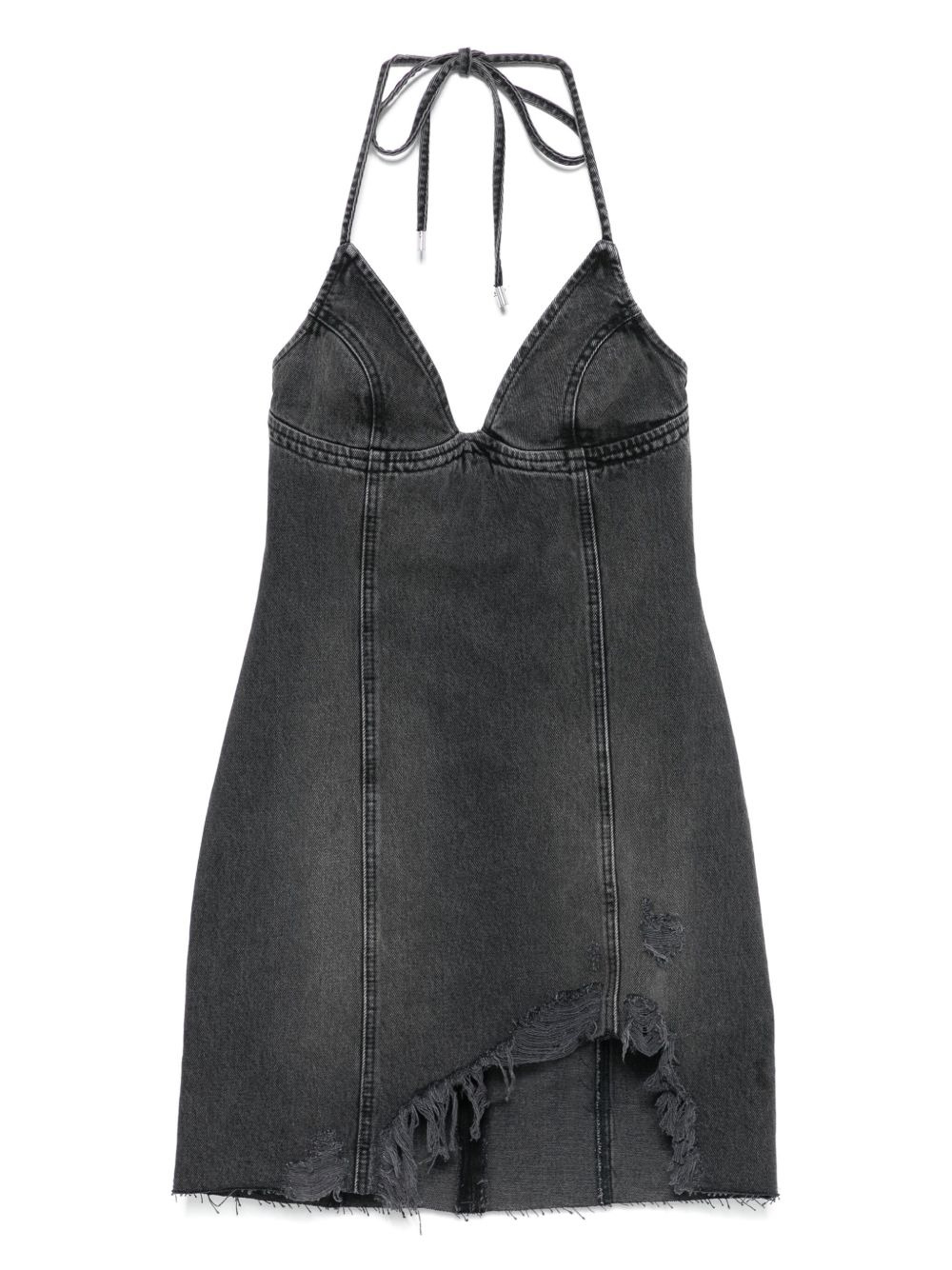 halter-neck frayed denim dress Highlights - Grey - Halter neck - Frayed hem - Asymmetrical hem Imported Composition Cotton 100% SIZE & FIT Model measurements Height 5 ft 9 in(1.75 m) Bust/Chest 34.64 in(88 cm) Hips 36.61 in(93 cm) Waist 26.37 in(67 cm) Washing instructions Machine Wash