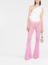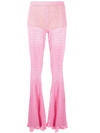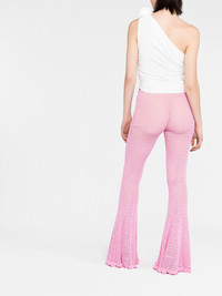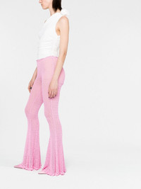knitted flared trousers Blumarine infiltrates the punchy bubblegum pink hue of these flared trousers with an intricate knitted construction, achieving an illusive, semi-sheer effect. Made in Italy Composition Lining: Polyester 88%, Spandex/Elastane 12% Outer: Viscose 70%, Cotton 30% SIZE & FIT Model measurements Height 5 ft 9 in(1.76 m) Bust/Chest 31.49 in(80 cm) Hips 36.61 in(93 cm) Waist 24.8 in(63 cm) Measurement INSIDE LEG 33.85 in(86 cm) HIPS 37 in(94 cm) WAIST 23.62 in(60 cm) Washing instructions Machine Wash
