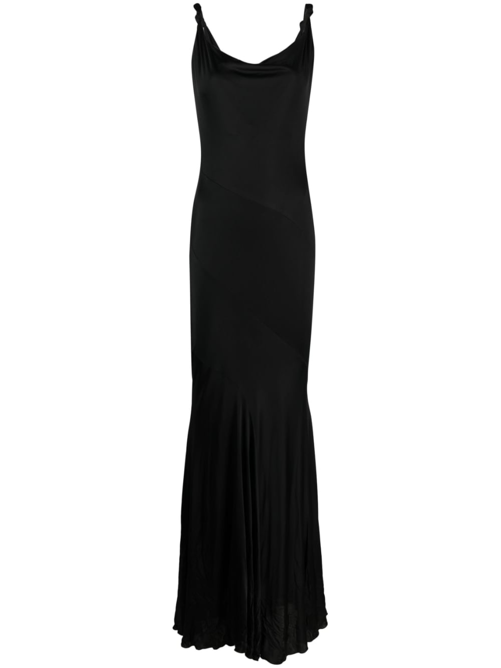 knot-detail satin gown Slinky silhouettes make up the foundations of Blumarine's SS23 collection, as evidenced by this sleek black gown. It's cut from satin to a languid profile that pools at the floor and is detailed simply by knots at the shoulders. Highlights - Black - Satin finish - Knot detailing - Cowl neck - Sleeveless - Low back - Pleated skirt - Full lining - Floor-length Made in Italy Composition Outer: Viscose 100% Lining: Polyamide 73%, Spandex/Elastane 27% Washing instructions Dry Clean Only