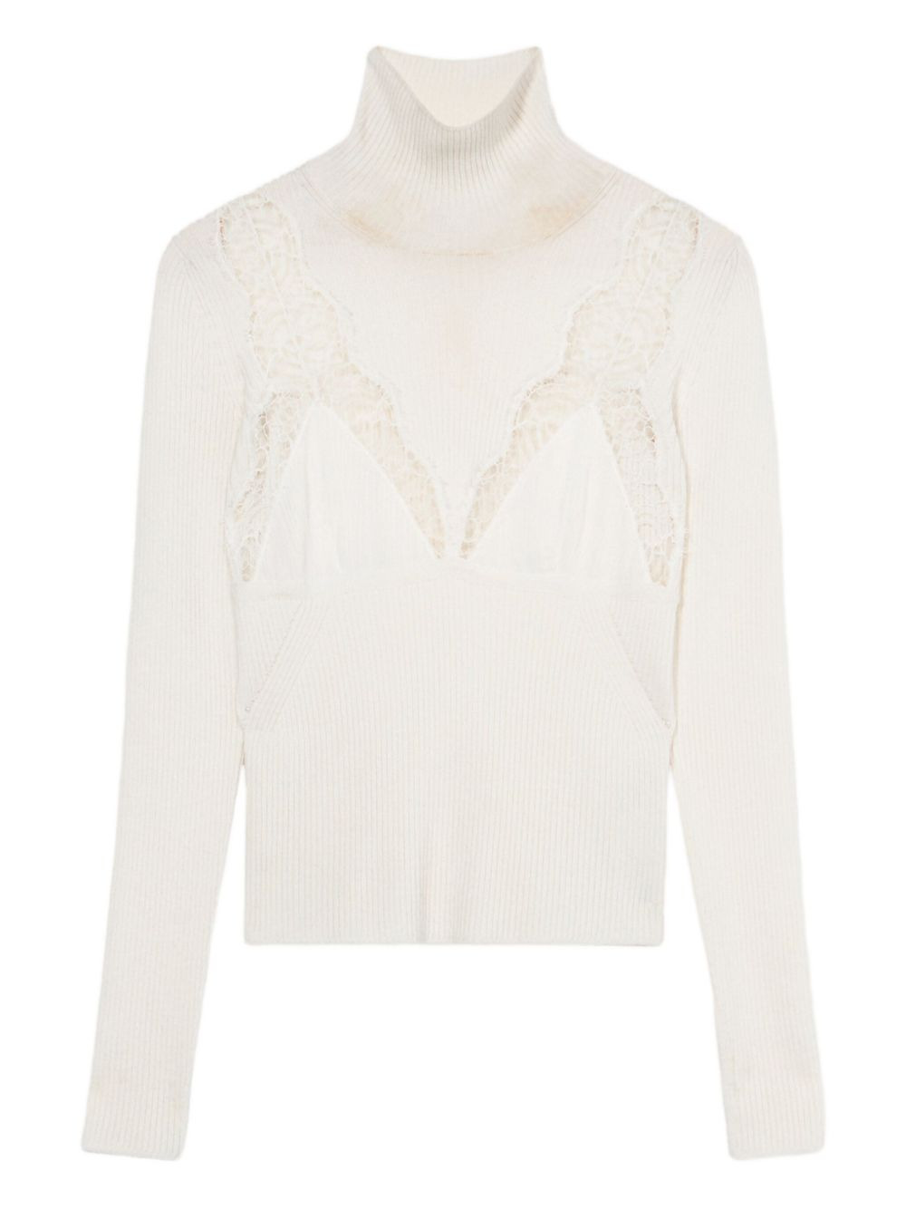 lace-embroidered turtleneck jumper Highlights - White - Ribbed texture - Sheer lace inserts - High neckline Imported Composition Wool 87%, Polyamide 10%, Elastane 3% Washing instructions Read Manufacturer Guidelines