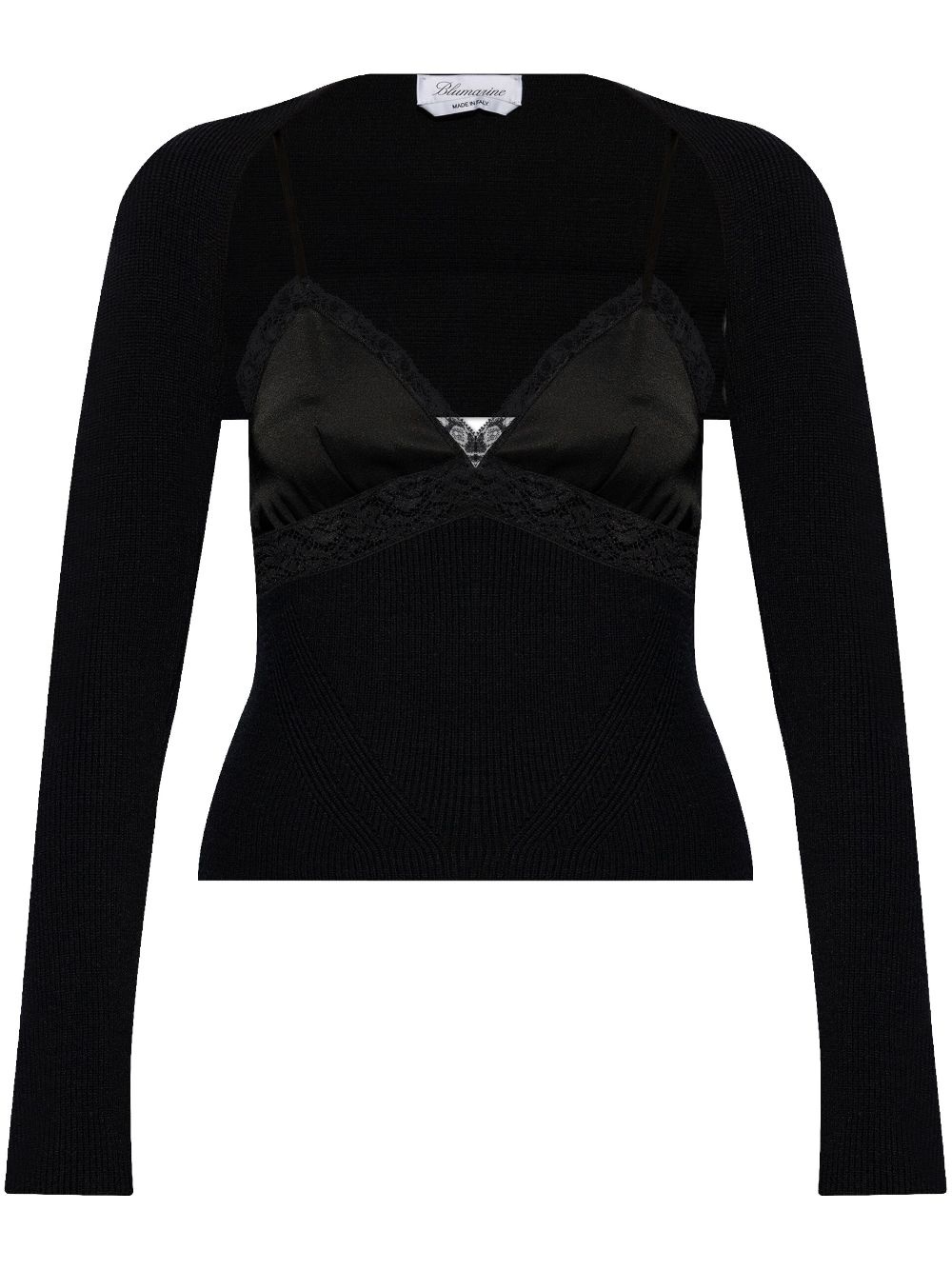 lace-panel knitted top Highlights - Black - Wool blend - Ribbed knit - Lace panelling - V-neck - Cut-out detailing - Long sleeves - Straight hem Made in Italy Composition Polyamide 38%, Acrylic 31%, Wool 20%, Polyester 11%