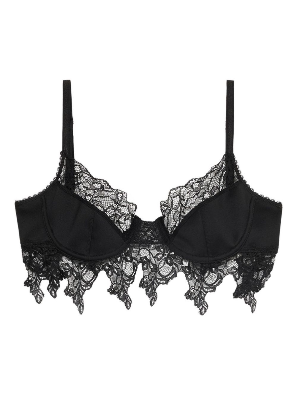 lace-trimmed bra top Highlights - Black - Scalloped lace detailing - Adjustable shoulder straps - Hook-and-eye closure - Delicate trim accents Imported Composition Polyester 85%, Elastane 15% Washing instructions Machine Wash
