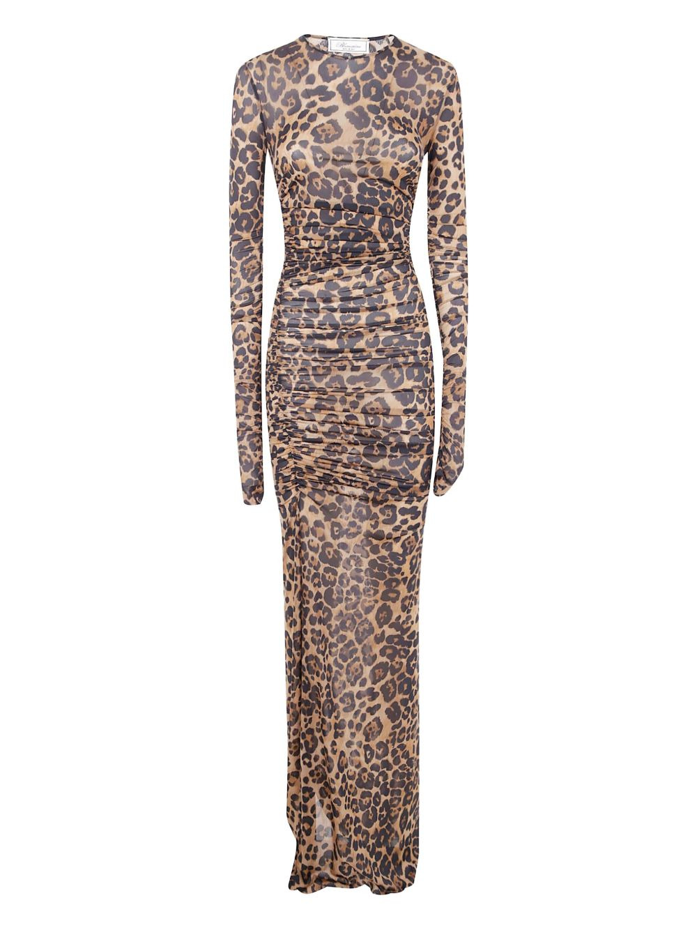 leopard-print ruched maxi dress Highlights - Brown and black - Leopard print - Ruched detailing - Long sleeves - Crew neck - Maxi length Imported Composition Polyamide 100% Washing instructions Read Manufacturer Guidelines