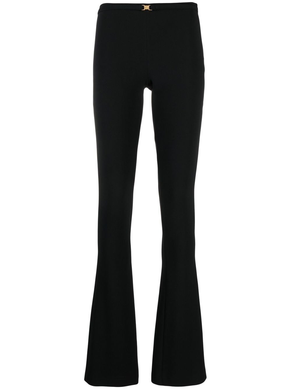 logo-buckle flared trousers black logo-buckle detail flared design slim cut bootcut high-waisted gold-tone hardware Made in Italy Composition Viscose 70%, Acetate 26%, Spandex/Elastane 4% SIZE & FIT Model measurements Height 5 ft 9 in(1.75 m) Bust/Chest 31.1 in(79 cm) Hips 33.46 in(85 cm) Waist 23.22 in(59 cm) FittingInformation This piece fits true to size. We recommend you get your regular size Designed to be fitted at the waist and hips, loose over the leg Made with a mid-weight fabric Washing instructions Dry Clean Only