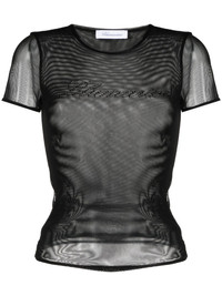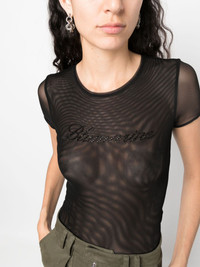 logo-embellished mesh T-shirt Highlights - Black - Stretch-design - Semi-sheer construction - Mesh design - Logo rhinestone embellishment - Round neck - Short sleeves - Straight hem Imported Composition Polyester 94%, Elastane 6% SIZE & FIT Model measurements Height 5 ft 9 in(1.75 m) Bust/Chest 33.07 in(84 cm) Hips 35.03 in(89 cm) Waist 24.01 in(61 cm) FittingInformation Designed for a slim fit that sits just away from the body offering a close yet comfortable fit Made from a midweight stretch fabric, this piece offers elasticity and flexibility when worn This piece fits true to size – take your usual size Washing instructions Machine Wash