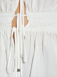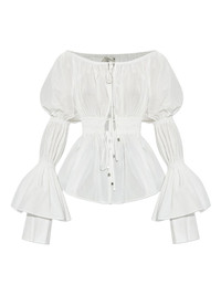 off-shoulder puff-sleeve top Highlights - White - Off-shoulder neck - Smocked waist - Drawstring fastening - Long puff sleeves - Flared hem Made in Italy Composition Polyester 52%, Cotton 48% Washing instructions Read Manufacturer Guidelines