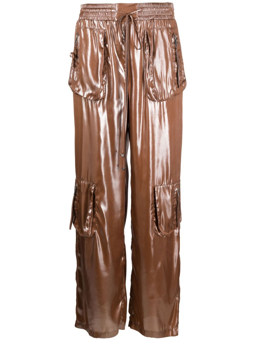 patch-pockets straight-leg trousers Highlights - Brown - Straight leg - Drawstring fastening - Elasticated waistband - Four front patch pockets - High waist - High-shine finish - Long length - Straight hem Made in Italy Composition Polyester 100% SIZE & FIT Model measurements Height 5 ft 9 in(1.75 m) Bust/Chest 33.07 in(84 cm) Hips 35.03 in(89 cm) Waist 24.01 in(61 cm) FittingInformation Designed with a wide-leg cut, these trousers allow for a close fit at the waist and offer a loose and roomy fit over the leg Adjust this piece’s waistband to your preference using the drawstring Made from a lightweight non-stretch fabric This piece fits true to size – take your usual size Washing instructions Dry Clean Only