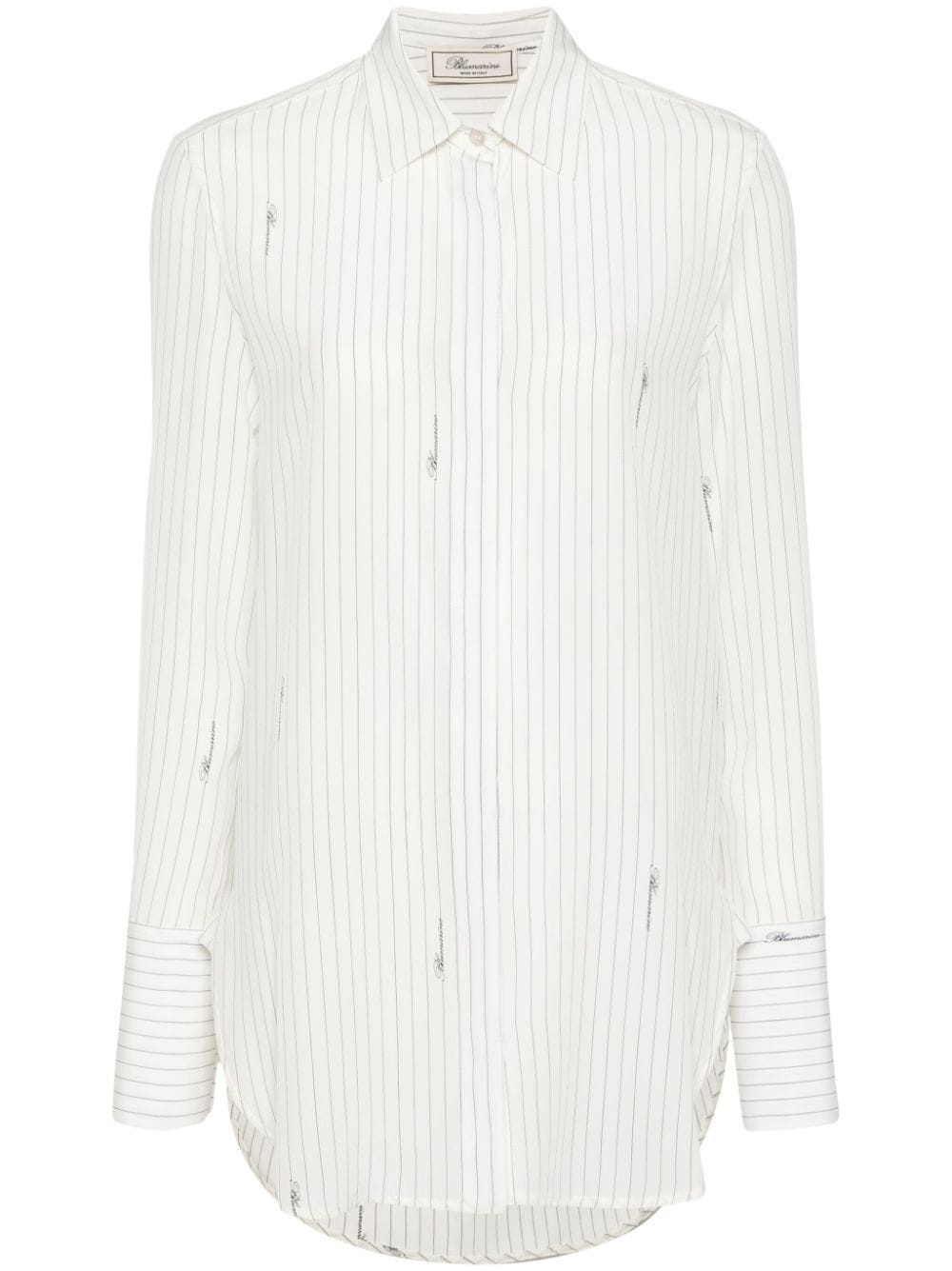 pinstriped shirt Highlights - White/black - Silk - Satin weave - Pinstripe pattern - Front button placket - Logo print embellishment - Classic collar - Long sleeves - Pleat detailing at the sleeves - Buttoned cuffs - Box-pleat detail to the rear - Unlined - Hem gusset - Curved hem Made in Italy Composition Silk 100% SIZE & FIT Model measurements Height 5 ft 10 in(1.78 m) Bust/Chest 33.85 in(86 cm) Hips 36.61 in(93 cm) Waist 26.77 in(68 cm) FittingInformation Designed to be unstructured, offering a loose fit throughout Made from a lightweight non-stretch fabric