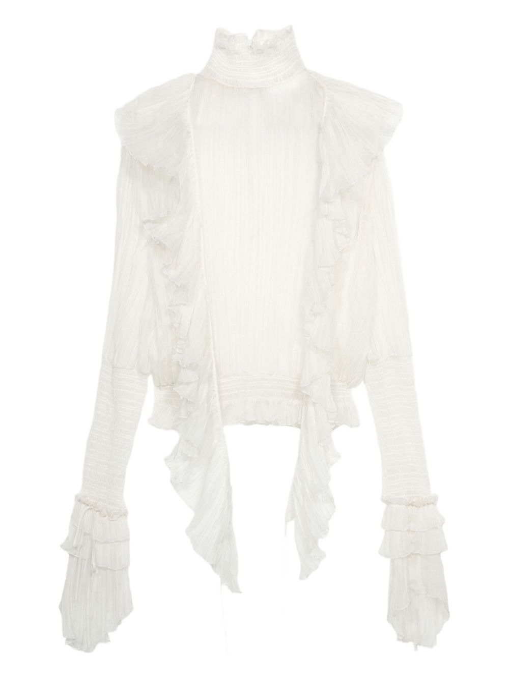pleated ruffle top Highlights - Off-white - Pleated texture - High neck - Ruffle detail - Long sleeves - Smocked cuffs Imported Composition Fabric 100%