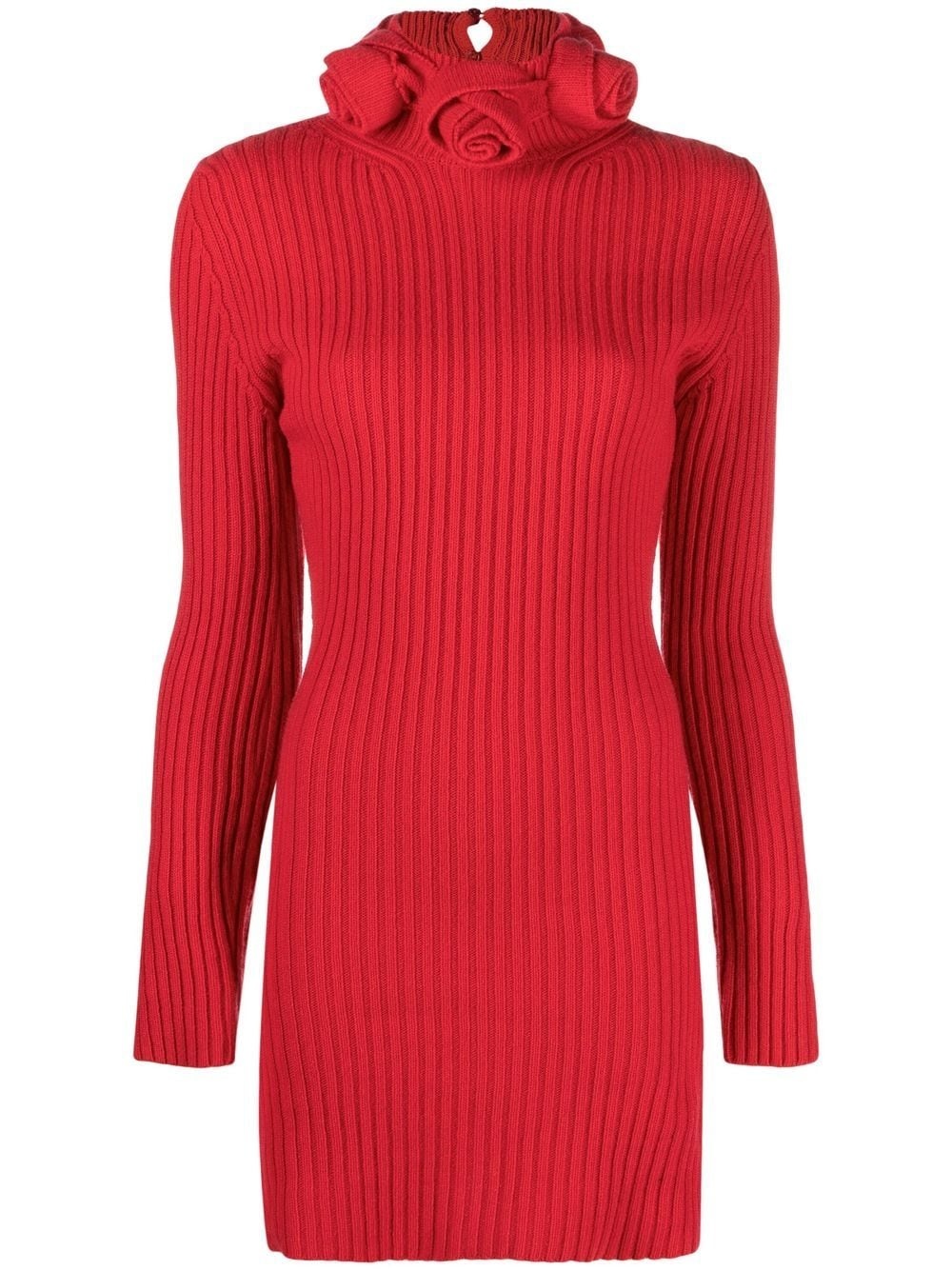 roll-neck wool mini dress Blumarine's knitted dress is given a polished update thanks to rich lipstick-red hue. It's accentuated further with the rose detailing at the collar. Made in Italy Composition Wool 100% SIZE & FIT Model measurements Height 5 ft 10 in(1.77 m) Bust/Chest 31.49 in(80 cm) Hips 35.03 in(89 cm) Waist 23.22 in(59 cm) FittingInformation This piece fits true to size. We recommend you get your regular size Cut for a slim fit Made with a mid-weight fabric Washing instructions Hand Wash