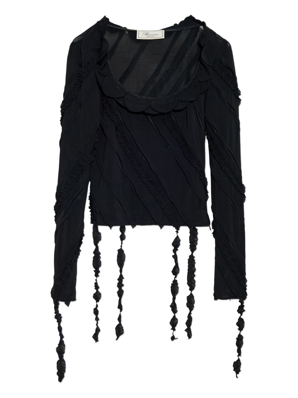 ruffled-detail long-sleeve top Highlights - Black - Ruffled neck - Long sleeves - Ruffles at the cuffs Made in Italy Composition Viscose 94%, Spandex/Elastane 6% Washing instructions Read Manufacturer Guidelines