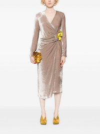 velvet midi dress Highlights - Grey - Velvet - Wrap design - V-neck - Long sleeves - Draped detailing - Detachable floral applique - Side slit - Mid-length Made in Italy Composition Lining: Polyester 100% Outer: Viscose 82%, PVC 50%, Cotton 50%, Silk 18% SIZE & FIT Model measurements Height 5 ft 9 in(1.75 m) Bust/Chest 34.64 in(88 cm) Hips 36.61 in(93 cm) Waist 26.37 in(67 cm) FittingInformation Designed for a slim fit that sits just away from the body offering a close yet comfortable fit Made from a midweight non-stretch fabric