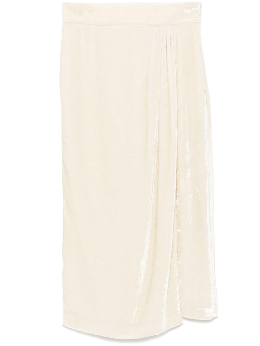velvet midi skirt Highlights - White - Crushed velvet - Concealed side zip fastening - Gathered detailing - Wrap design - Column silhouette - Straight hem - Full lining - Mid-length Made In Italy Composition Outer: Viscose 82%, Silk 18% Lining: Polyester 100% SIZE & FIT Model measurements Height 5 ft 11 in(1.8 m) Bust/Chest 31.49 in(80 cm) Hips 36.61 in(93 cm) Waist 24.4 in(62 cm) FittingInformation This midi-length skirt is intended to be worn high on the waist Made from a midweight non-stretch fabric