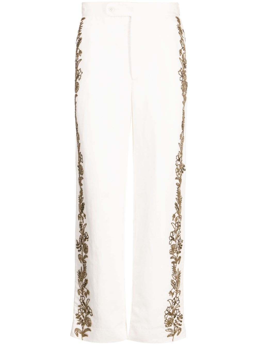 beaded straight-leg trousers Highlights - White/gold-tone - Cotton-linen blend - Bead embellishment - Concealed fly and button fastening - Straight leg - Two side inset pockets - Two rear flap pockets - Straight hem Imported Composition Body: Linen/Flax 52%, Cotton 48% SIZE & FIT Model measurements Height 6 ft 2 in(1.89 m) Bust/Chest 37.4 in(95 cm) Hips 36.61 in(93 cm) Waist 28.34 in(72 cm) FittingInformation Designed for a tapered leg, offering a loose unrestricted fit over the leg with a closer fit towards the ankle The adjustable tabs allow for fitted preferences Made from a heavyweight non-stretch fabric This piece fits true to size – take your usual size Washing instructions Dry Clean Only