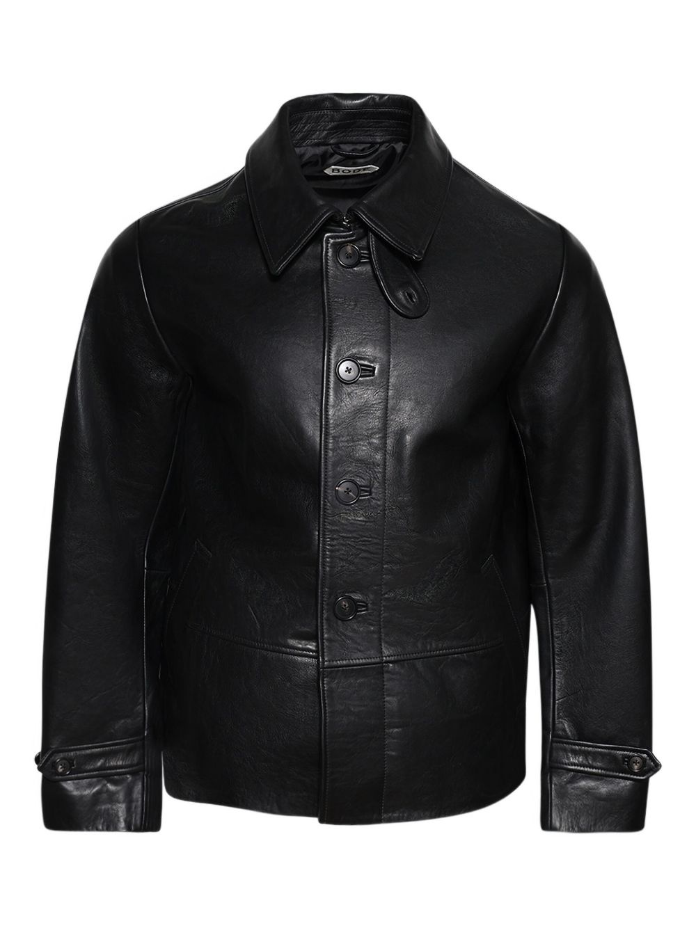 button-up leather jacket Highlights - Black - Button fastening - Classic collar - Long sleeves Imported Composition Leather 100% Washing instructions Specialist Cleaning