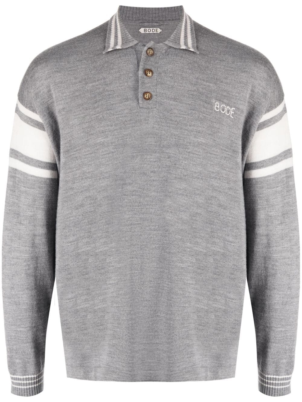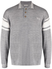 logo-embroidered striped polo shirt Highlights - Grey - Wool - Embroidered logo at the chest - Stripe detailing - Polo collar - Front button placket - Long sleeves - Ribbed trim - Straight hem Made in Italy Composition Wool 100% SIZE & FIT Model measurements Height 6 ft 2 in(1.89 m) Bust/Chest 37.4 in(95 cm) Hips 36.61 in(93 cm) Waist 28.34 in(72 cm) Measurement CHEST 45.66 in(116 cm) SLEEVE LENGTH 20.47 in(52 cm) LENGTH 25.19 in(64 cm) Shoulder Width 20.07 in(51 cm) FittingInformation Designed for a regular fit, offering a comfortable loose fit throughout the body Made with a midweight knit, this piece offers some stretch This piece fits true to size – take your usual size Washing instructions Dry Clean Only