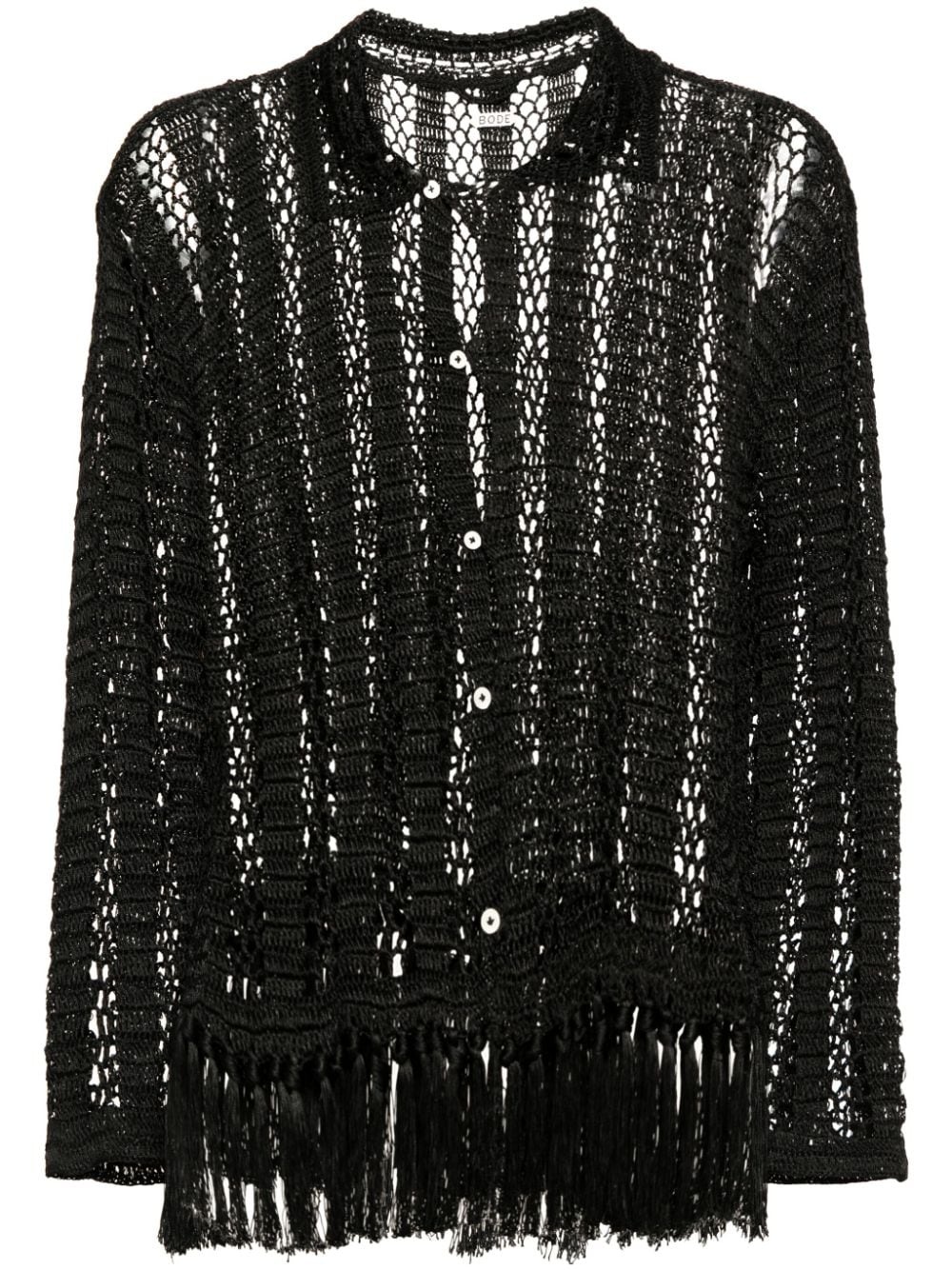 open-knit fringed shirt Highlights - Black - Open knit - Fringe detailing - Spread collar - Front button fastening - Long sleeves - Straight hem Imported Composition Viscose 100% SIZE & FIT Model measurements Height 6 ft 2 in(1.87 m) Bust/Chest 38.18 in(97 cm) Hips 36.61 in(93 cm) Waist 29.13 in(74 cm) FittingInformation Designed for a slim fit, offering a comfortable fit that sits just away from the body Made from a midweight non-stretch fabric, this piece offers minimal elasticity when worn This piece fits true to size – take your usual size Washing instructions Hand Wash