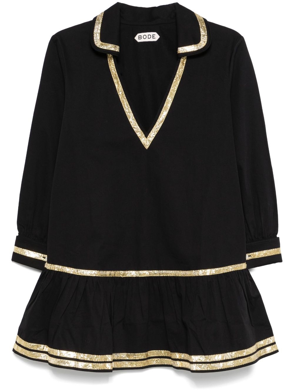 Tinsel Tape mini dress Highlights - Black/gold-tone - Cotton - Twill weave - Gold-tone trim - Classic collar - V-neck - Long sleeves - Buttoned-cuff sleeves - Unlined - Flared hem - Thigh-length Imported Composition Cotton 100% SIZE & FIT Model measurements Height 5 ft 11 in(1.8 m) Bust/Chest 33.07 in(84 cm) Hips 37.4 in(95 cm) Waist 25.19 in(64 cm) FittingInformation Designed for a relaxed fit, this piece allows for comfort and movement when worn Made from a midweight non-stretch fabric