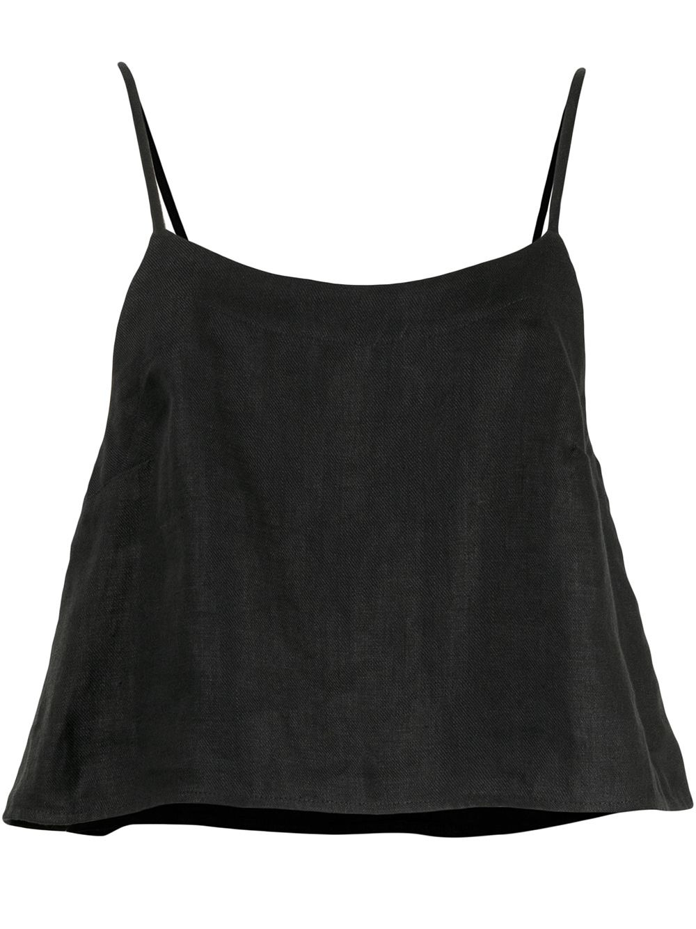 flared cropped slip top Highlights - Black - Linen - Round neck - Spaghetti straps - Cropped Imported Composition Linen/Flax 100% SIZE & FIT Model measurements Height 5 ft 10 in(1.77 m) Bust/Chest 31.49 in(80 cm) Hips 34.64 in(88 cm) Waist 23.62 in(60 cm) Measurement WAIST 38.58 in(98 cm) BUST 33.85 in(86 cm) LENGTH 11.81 in(30 cm) FittingInformation This piece fits true to size. We recommend you get your regular size Cut for a loose fit Made with a mid-weight non-stretch fabric Washing instructions Hand Wash