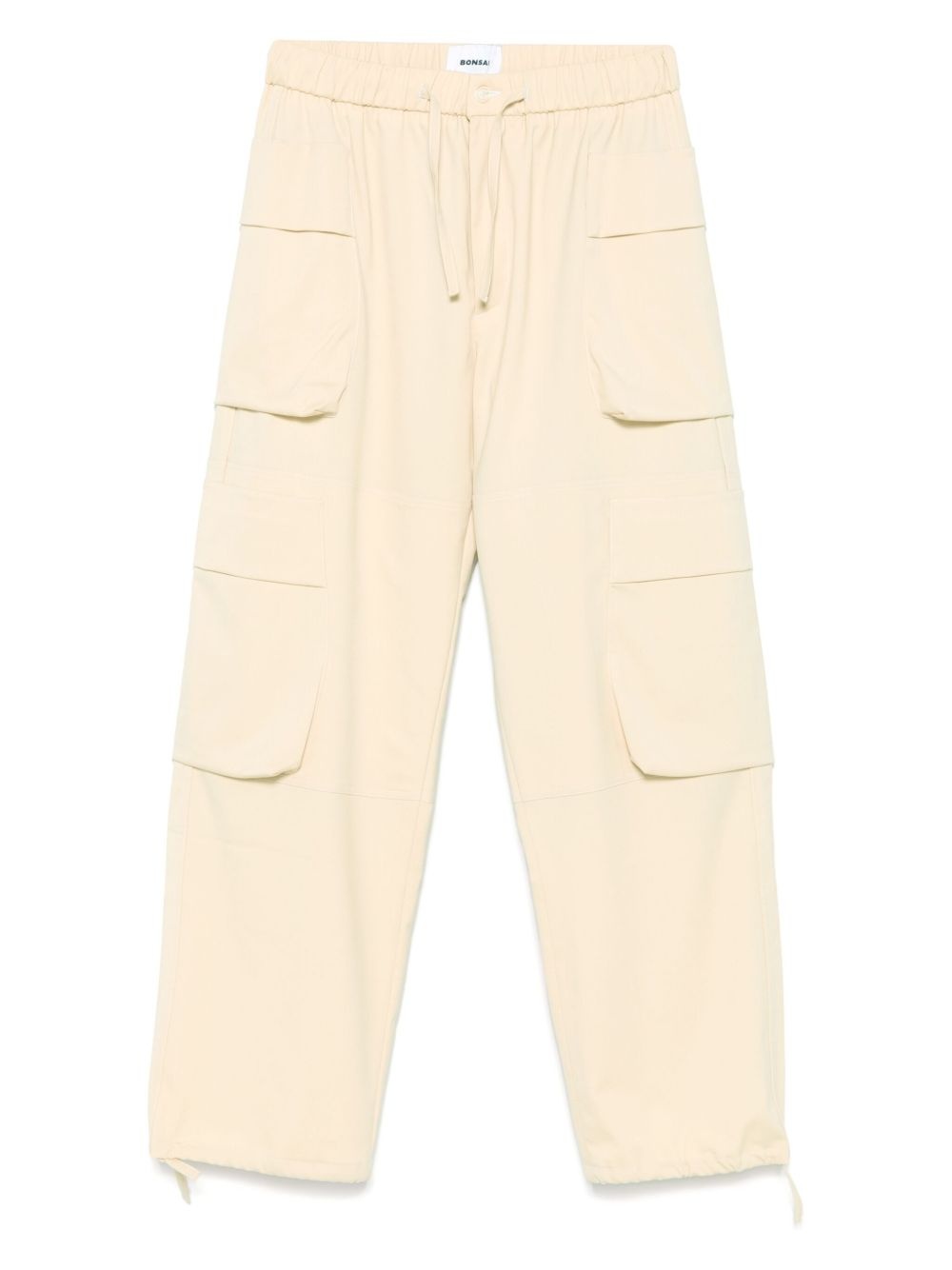 drawstring cargo pants Highlights - Light yellow - Button fly fastening - Elasticated waistband - Two side flap pockets - Drawstring cuffs Imported Composition Polyester 54%, Virgin Wool 44%, Spandex/Elastane 2% SIZE & FIT Model measurements Height 6 ft 2 in(1.87 m) Bust/Chest 37 in(94 cm) Hips 33.85 in(86 cm) Waist 27.95 in(71 cm) FittingInformation Designed for a relaxed straight leg, allowing a comfortable and loose fit over the leg The internal drawstring at the hem allows for fitted preferences at the ankle Made from a midweight stretch fabric, this piece offers elasticity and flexibility when worn