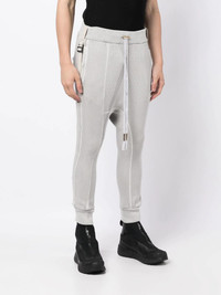 crop-crotch detail track pants ash grey cotton contrasting trim elasticated ankles elasticated drawstring waistband two side inset pockets rear welt pocket Imported Composition Cotton 100% SIZE & FIT Model measurements Height 6 ft 0 in(1.83 m) Bust/Chest 37.79 in(96 cm) Hips 37 in(94 cm) Waist 30.31 in(77 cm) FittingInformation This piece fits true to size. We recommend you get your regular size Cut for a slim fit Made with a mid-weight fabric