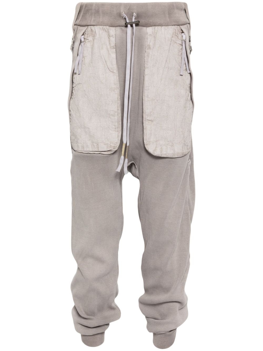 drawstring drop-crotch trousers Highlights - Light grey - Cotton blend - Elasticated drawstring waistband - Two adjustable straps - Two side zip-fastening pockets - Panelled design - Stretch-jersey - Two rear zip-fastening pockets - Ribbed ankles - Drop crotch Imported Composition Cotton 90%, Elastane 10% SIZE & FIT Model measurements Height 6 ft 2 in(1.88 m) Bust/Chest 34.25 in(87 cm) Hips 34.64 in(88 cm) Waist 26.77 in(68 cm) FittingInformation Designed with a dropped crotch, offering a loose and relaxed fit The ribbed hem at the ankle offers a close, comfortable fit Made from a midweight stretch fabric, this piece offers elasticity and flexibility when worn