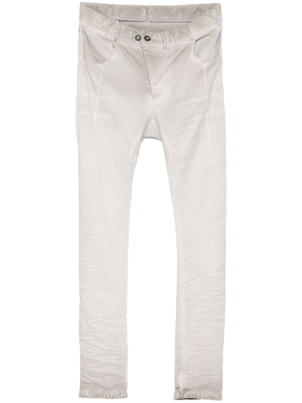 drop-crotch skinny trousers Highlights - Light grey - Cotton blend - Mid-rise - Drop crotch - Belt loops - Button fly fastening - Two rounded pockets to the sides - Two rear patch pockets - Skinny cut - This piece comes complete with a protective dust bag. Imported Composition Cotton 98%, Lyocell 2% SIZE & FIT Model measurements Height 6 ft 2 in(1.87 m) Bust/Chest 33.07 in(84 cm) Hips 35.43 in(90 cm) Waist 26.77 in(68 cm) FittingInformation Designed for a slim fit, offering a comfortable fit that sits just away from the leg Adjust this piece’s waistband to your preference using the drawstring Made from a midweight stretch fabric, this piece offers elasticity and flexibility when worn