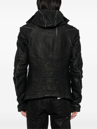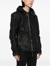 leather jacket Highlights - Black - Leather - Front two-way zip fastening - Detachable hood - Two side zip-fastening pockets - Contrast stitching - Long sleeves - Full lining Imported Composition Horse Leather 100% SIZE & FIT Model measurements Height 6 ft 2 in(1.87 m) Bust/Chest 33.07 in(84 cm) Hips 35.43 in(90 cm) Waist 26.77 in(68 cm) FittingInformation Designed to be unstructured, offering a loose fit throughout The detachable panel offers the preference for a different fit Firm leather offering little flexibility to maintain its durability and sturdiness