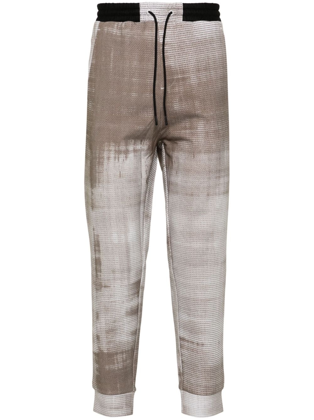 abstract-pattern track pants Highlights - Light brown/black - Cotton blend - Abstract pattern print - Elasticated waistband - Two side slit pockets - Rear slit pocket - Tapered leg - Elasticated ankles - Rubberised logo detail - Drawstring fastening Imported Composition Cotton 80%, Polyester 15%, Elastane 5% SIZE & FIT Model measurements Height 6 ft 2 in(1.87 m) Bust/Chest 36.41 in(92.5 cm) Hips 35.43 in(90 cm) Waist 29.52 in(75 cm) FittingInformation Designed for a relaxed tapered leg, allowing a comfortable loose fit above the knee with a closer fit towards the calves Adjust this piece’s waistband to your preference using the drawstring Made from a midweight stretch fabric, this piece offers elasticity and flexibility when worn This piece fits true to size – take your usual size