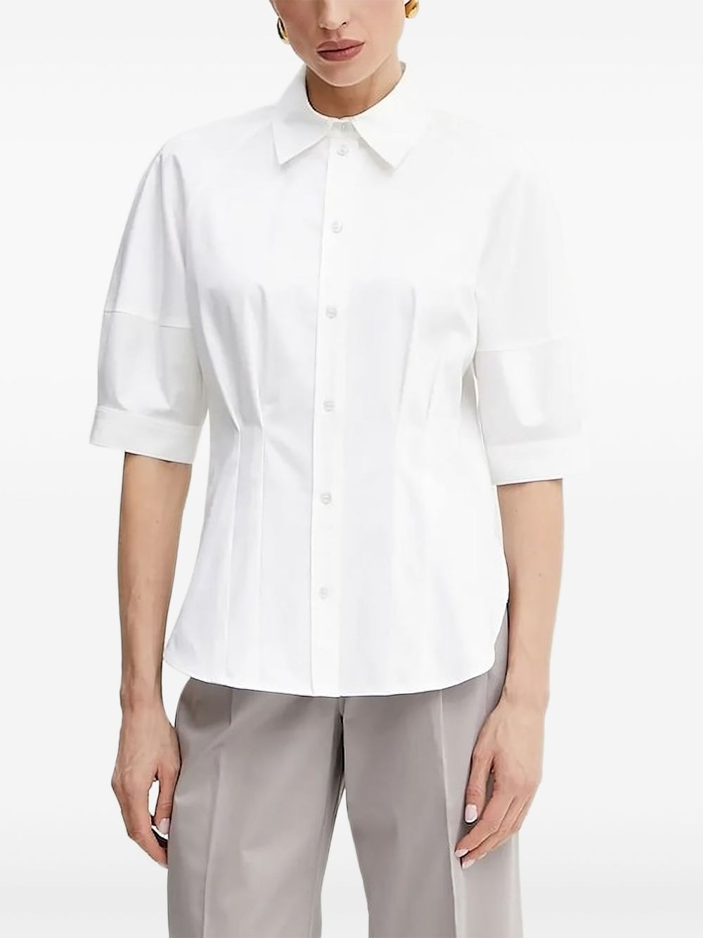 button-front fitted shirt Highlights - White - Cotton-blend - Short sleeves - Fitted waist - Button fastening - Collared neck Imported Composition Cotton 96%, Elastane 4% Washing instructions Read Manufacturer Guidelines
