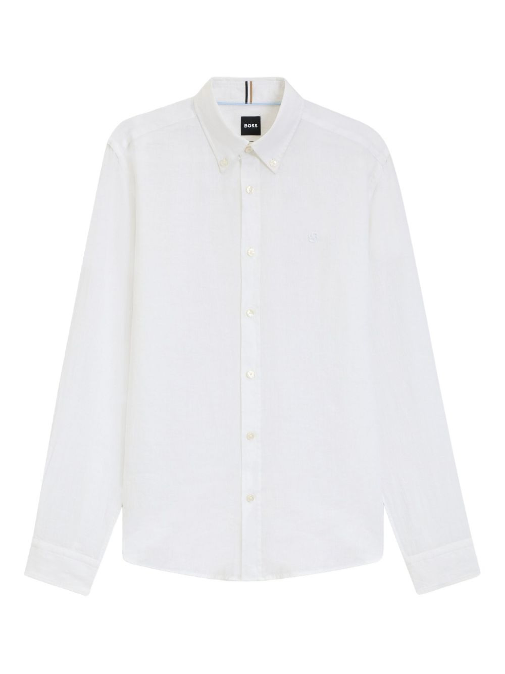 button-up long-sleeve shirt Highlights - White - Button-down collar - Button fastening - Embroidered logo detail - Buttoned cuffs Imported Composition Linen/Flax 100% Washing instructions Read Manufacturer Guidelines