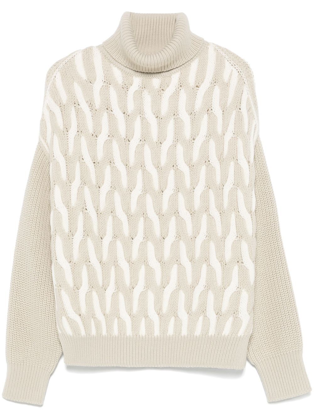 cable-knit sweater Highlights - Light beige/white - Virgin wool - Cable knit - Roll neck - Drop shoulder - Long sleeves - Silver-tone logo plaque - Straight hem Imported Composition RWS Virgin Wool 100% Washing instructions Hand Wash
