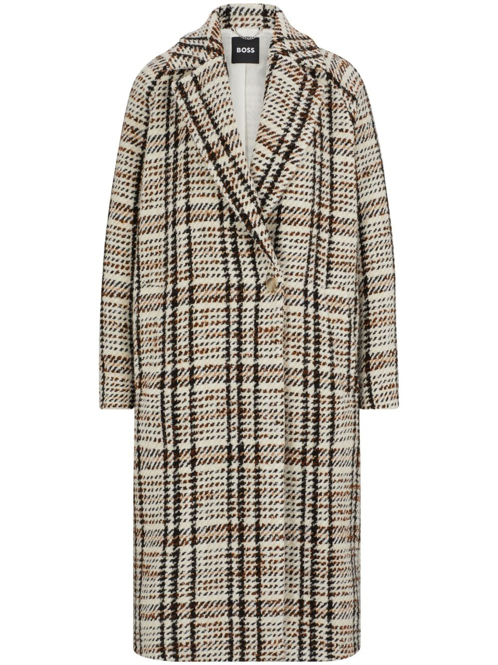 check-pattern coat Highlights - Cedar brown/light beige - Check pattern - Notched lapels - Double-breasted button fastening - Long sleeves - Straight hem Imported Composition Outer: Polyester 59%, Acrylic 18%, Wool 17%, Virgin Wool 4%, other fibers 2% Lining: Viscose 100%