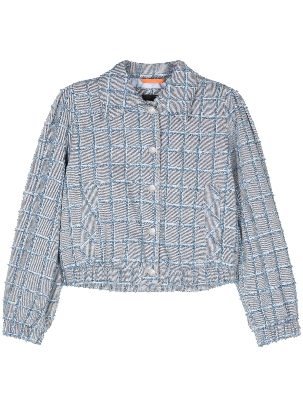 check-pattern tweed jacket Highlights - Medium blue - Recycled cotton blend - Tweed - Check pattern - Pointed flat collar - Long sleeves - Elasticated cuffs - Two side slit pockets - Full lining - Elasticated hem - Front button fastening Imported Composition Outer: Recycled Cotton 63%, Acrylic 23%, Polyester 9%, other fibers 5% Lining: Cotton 50%, Polyester 50% Washing instructions Machine Wash