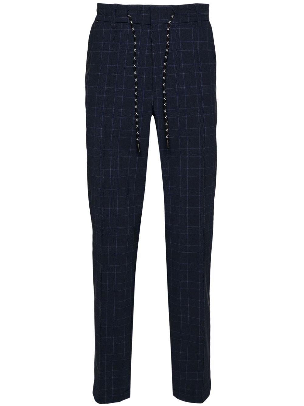 checked mid-rise tapered trousers Highlights - Midnight blue - Stretch-design - Check pattern - Embossed logo to the rear - Exposed-seam detailing - Mid-rise - Belt loops - Elasticated drawstring waistband - Concealed front fastening - Two diagonal pockets to the sides - Two rear welt pockets - Tapered leg Imported Composition Polyamide 76%, Elastane 24%