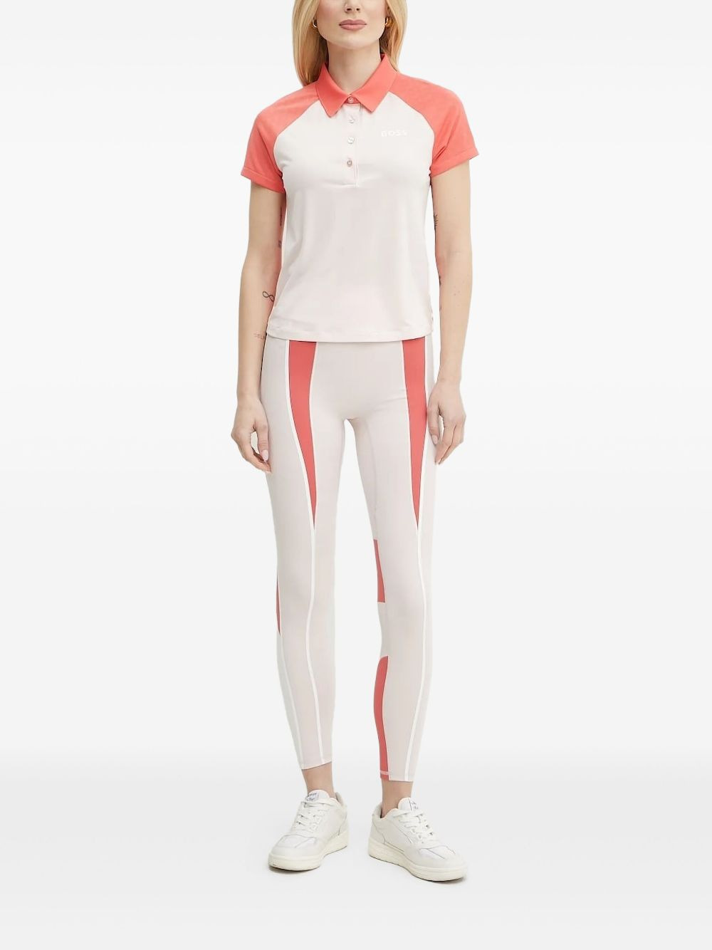 colour-block polo shirt Highlights - Coral pink - Short sleeves - Raglan sleeves - Polo collar - Four-button placket - Logo print Imported Composition Outer: Polyester 92%, Elastane 8% Washing instructions Read Manufacturer Guidelines