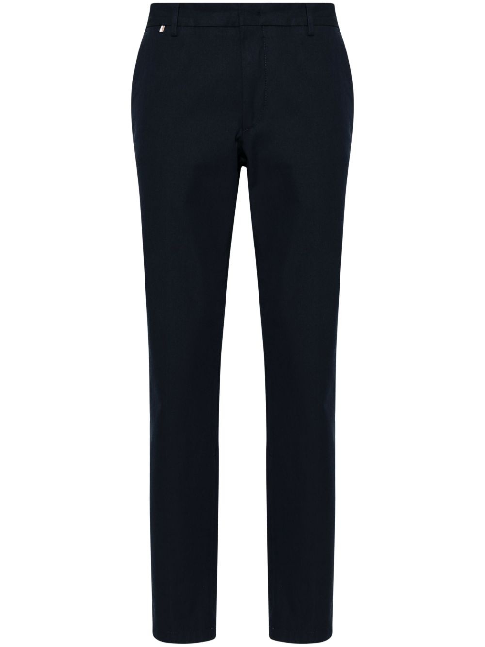 tapered-leg cotton-blend trousers Combining impeccable craftsmanship with classic silhouettes, BOSS presents these straight-leg trousers. Crafted from stretch-cotton, the navy-blue pair is decorated with two side zip pockets for added functionality. Highlights - Navy blue - Cotton blend - Belt loops - Concealed front fastening - Two side slit pockets - Two rear jetted pockets - Tapered leg Imported Composition Cotton 62%, Polyamide 38%