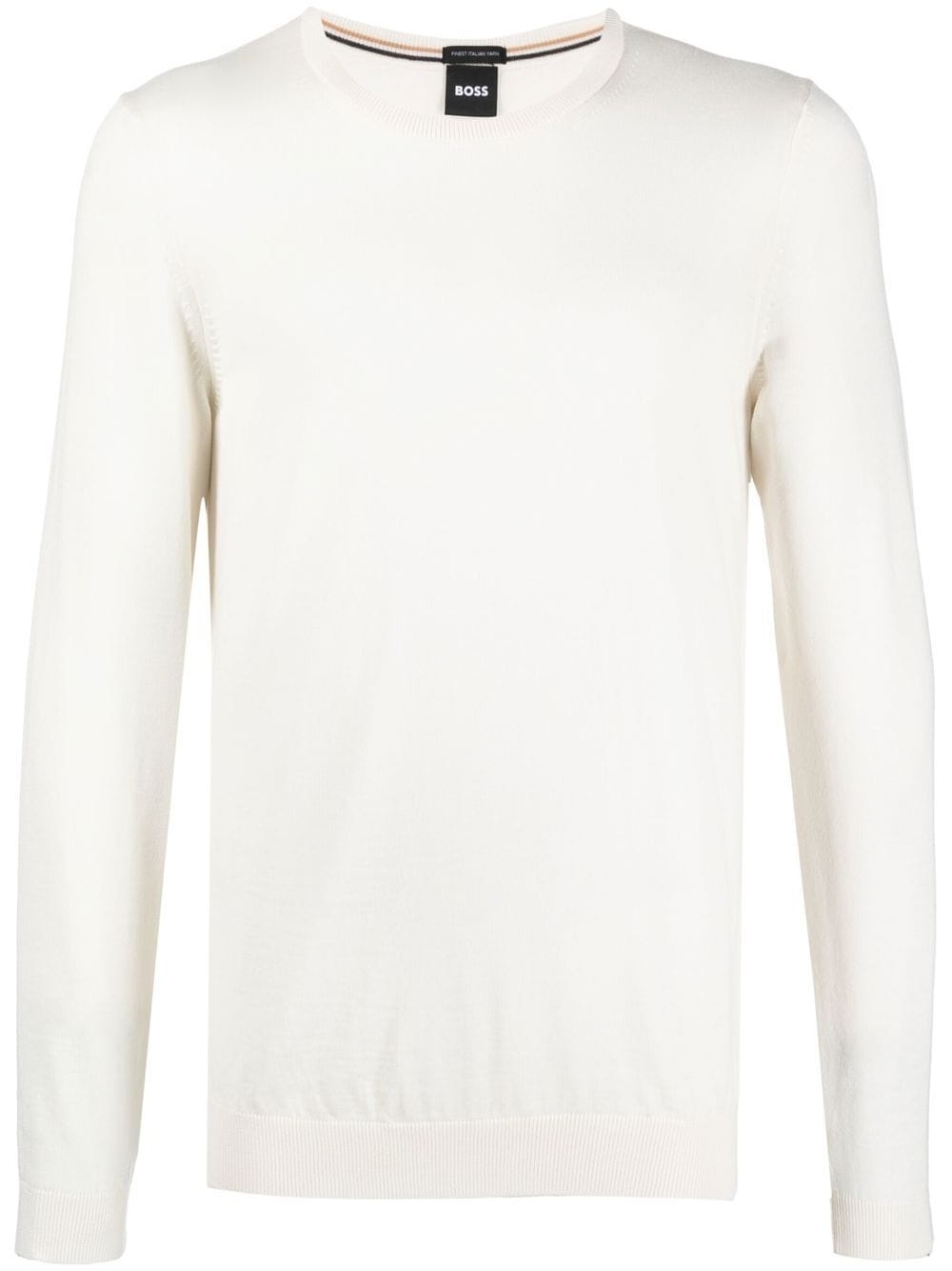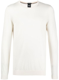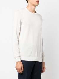 crew neck pullover sweater off-white virgin wool fine knit crew neck long sleeves ribbed trim Made in Italy Composition Virgin Wool 100% SIZE & FIT Model measurements Height 6 ft 2 in(1.87 m) Bust/Chest 36.41 in(92.5 cm) Hips 35.43 in(90 cm) Waist 29.52 in(75 cm) FittingInformation Designed for a slim fit, offering a comfortable fit that sits just away from the body Made with a lightweight knit, this piece offers some stretch This piece fits true to size – take your usual size Washing instructions Machine Wash