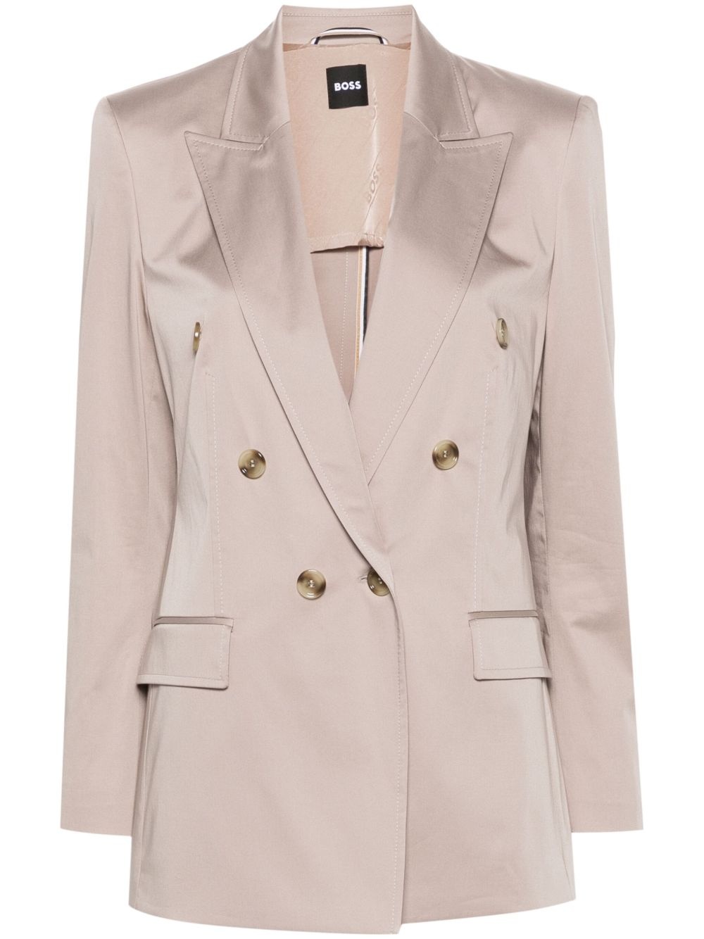 double-breasted satin blazer Highlights - Sesame beige - Cotton blend - Satin weave - Peak lapels - Long sleeves - Two front flap pockets - American rear vent - Internal slip pocket - Full lining - Double-breasted button fastening Imported Composition Lining: Viscose 61%, Polyester 35%, Elastane 4% Outer: Cotton 96%, Elastane 4% SIZE & FIT Model measurements Height 5 ft 11 in(1.8 m) Bust/Chest 33.07 in(84 cm) Hips 37.4 in(95 cm) Waist 25.19 in(64 cm) FittingInformation Designed for a slim fit that sits just away from the body offering a close yet comfortable fit The internal shoulder pads offer a structured shape Made from a midweight stretch fabric, this piece offers elasticity and flexibility when worn This piece fits true to size – take your usual size